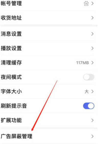 我們進入設置之后,然后我們點擊下面的廣告屏蔽管理的功能,如圖所示。